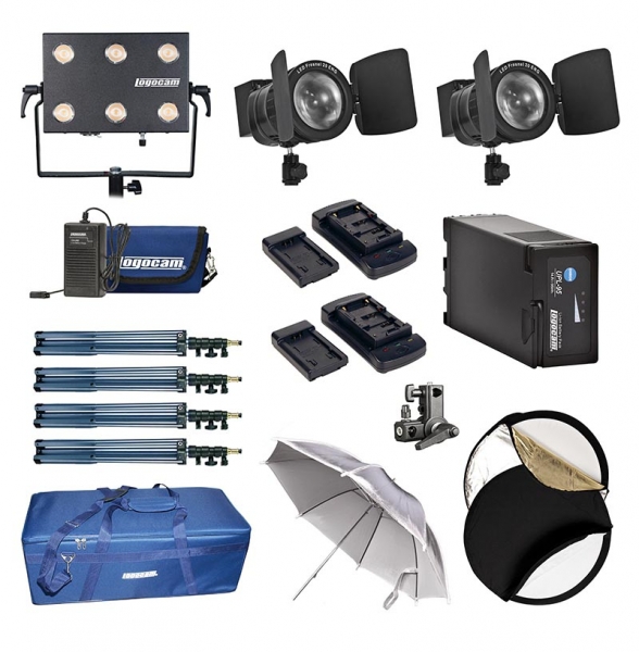 Автономный компактный осветительный комплект Logocam A-LED 700 LFF DIM KIT оптимален для съемок на выезде или в любом месте, где работа от сети нежелательна или невозможна. Состоит из одного компактного универсального светодиодного светильника Logocam LED Light mini U со световым потоком, эквивалентным мощности галогенного светильника 800 Вт, и двух светодиодных прожекторов с линзой Френеля Logocam LED Fresnel 20 ENG со световым потоком, эквивалентным мощности галогенного светильника 130 Вт. Наличие двух зонтов и двух рефлекторов дает дополнительную возможность более тонкой настройки освещения. В качестве автономного источника электроэнергии используются 2 комплекта портативного электропитания UPL-47 KIT, комплект электропитания PK-3(X) и аккумуляторная батарея UPL-65. Возможна работа от сети 220 В (источники питания идут в комплекте). Поставляется в транспортировочном кофре с водоотталкивающей пропиткой. Этот осветительный комплект может быть использован для решения любых осветительных задач. Время автономной работы составляет более 2 часов. Масса комплекта 11 кг.