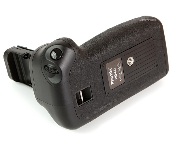 Батарейный блок Phottix BG-6D для Canon 6D. Повышает скорость съёмки и увеличивает время автономной работы. В качестве источника питания блока используются шесть стандартных элемента питания типа АА или два специальных аккумулятора LP-E6. Для удобства съёмки вертикальных кадров, на рукоятке расположены дополнительная вертикальная кнопка спуска затвора, кнопки AF/On, FEL и AF Points, а также кнопки управления и выключатель блока. Эргономичная конструкция рукоятки батарейного блока позволяет более удобно держать камеру при съёмке и управлять ей в вертикальном положении. Имеется встроенный разъём для крепления штатива.