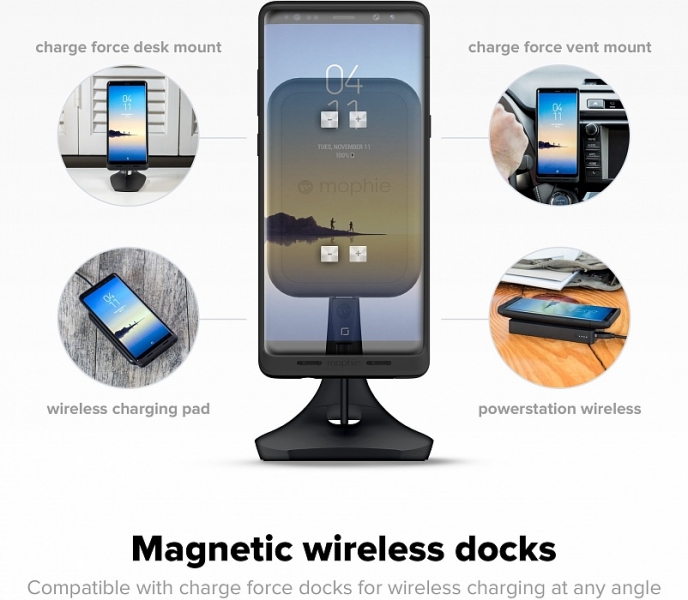 Mophie Juice Pack имеет встроенный аккумулятор емкостью 2950 мАч и обеспечивает более долгий срок службы штатной батареи Samsung Galaxy Note 8. Чехол имеет LED-индикацию, отображающую уровень заряда встроенной в него батареи. Модель поддерживает практически все виды беспроводных зарядок, а встроенные магниты позволят закреплять телефон в специальных держателях. Зарядка чехла осуществляется одновременно со смартфоном, при этом коммуникатор будет заряжаться первым.