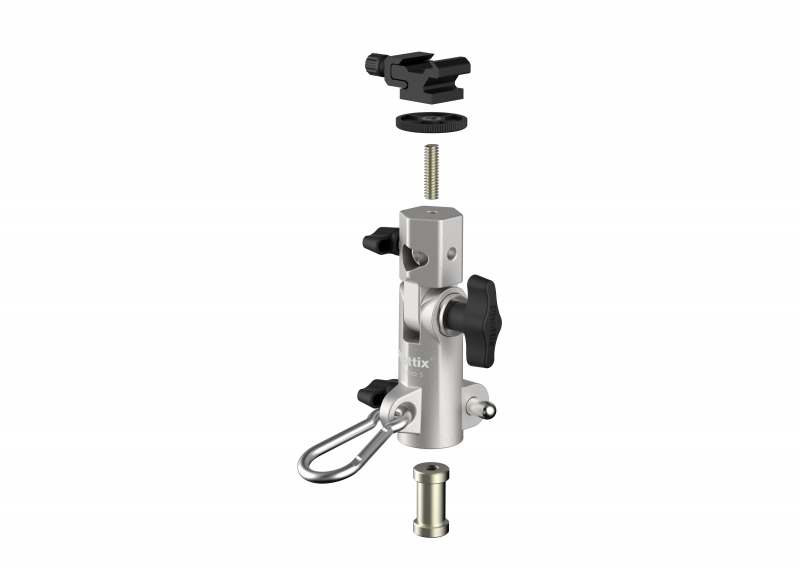 С помощью держателя Varos Pro S можно просто установить и зафиксировать зонт или вспышку под любым углом. Он имеет крепление холодный башмак, обратимый адаптер с наружной резьбой 1/4” сверху, а также стандартную внутреннюю резьбу нижнего крепления 3/8”, и два центральных вставных крепления со внутренней резьбой 1/4” и 3/8”.