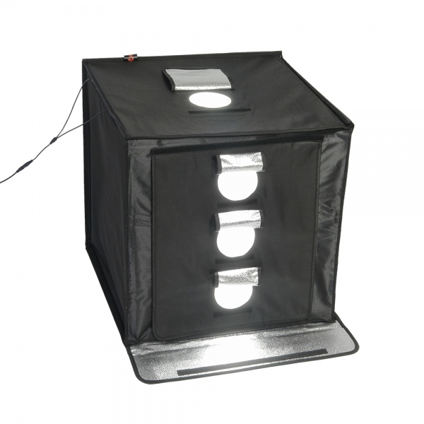 Конструкция разворачивается в квадратный легкий фотобокс и оборудована своим собственным источника света с цветовой температурой 5500К. Внутренние серебристые текстурированные стенки равномерно заполняют куб отраженным светом от двух светодиодных линеек (по 44 светодиода на каждой). Светодиодные линейки установлены на верхней крышке фотобокса, их можно легко переместить вдоль крышки благодаря системе липких лент (велкро). Монтаж конструкции осуществляется также с помощью липких лент, расположенных по периметру стенок. В сложенном виде фотобокс занимает мало места, складывается в кейс с ручкой.