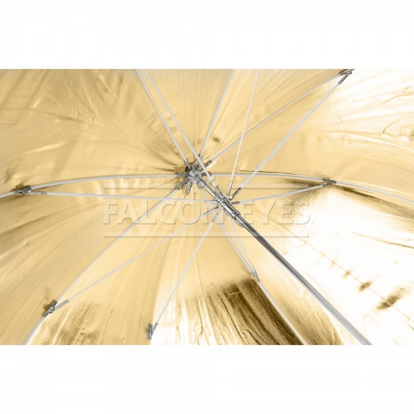 Золотистая поверхность придает отраженному свету теплые золотистые тона, часто используется в портретной съемке в качестве моделирующего или контрового источника (например, для того чтобы подчеркнуть теплым светом очертания фигуры). Возможно использовать сочетания поверхностей (просвечивающей и отражающих серебристой/золотистой) для усреднения формируемого эффекта - получения более контролируемого и направленного света (чем при использовании просвечивающей поверхности), и менее контрастного мягкого (чем при использовании серебристой/золотистой поверхности) Прочные эластичные спицы из стекловолокна и соединительные элементы из ударопрочного пластика для долговечного использования - спицы не ржавеют, сохраняют форму на протяжении всего срока эксплуатации, устойчивы к механическим воздействиям. Ткань из полиэстера обладает высокой износостойкостью.
