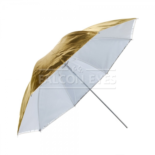 Зонт-отражатель URK-60TGS универсальный, предназначен для рассеивания света от источников освещения. В комплекте двусторонний отражатель золото/серебро и полупрозрачный рассеиватель. Данная модель позволяет комбинировать поверхности для получения 5 модификаций: просвечивающий / золотистый / серебристый / просвечивающий+золотистый / просвечивающий+серебристый. Диаметр 122 см. Просветный зонт покрыт белой полупрозрачной тканью. Световой поток от вспышки попадает на ткань зонта, максимально рассеивается и, увеличивая площадь излучения, равномерно освещает объект съемки. Таким образом, резкий точечный свет, излучаемый при срабатывании фотовспышки, преобразуется в достаточно мягкий световой поток, излучаемый с большей площади. Серебристая поверхность зонта дает более жесткий, по сравнению с белыми зонтами, свет, что позволяет получать контрастное изображение с четкими тенями.