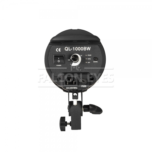 Плавная регулировка мощности от 0 до 100% осуществляется поворотом диммера (вращающимся переключателем) расположенного на торцевой части осветителя. Там же, для быстрого включения осветителя на полную мощность, (когда нет времени настраивать интенсивность светового потока) предусмотрен режим «FULL Power». В осветителе установлена галогеновая лампа модели THL-1000 с патроном G9.5. Цветовая температура ламп подобного типа составляет 3200К («Солнце через час после восхода»). С галогеновыми осветителями рекомендуется использовать жаропрочные софтбоксы (Falcon Eyes SBQ BW-выполнены из термостойкого материала, оснащены дополнительными вентиляционными шторками и поставляются в комплекте с сотовыми насадками), либо фотозонты на просвет или отражение (Falcon Eyes UR) . Крепление на стойку для QL-1000BW осуществляется при помощи металлического кронштейна, его можно передвигать вдоль по нижнему основанию моноблока для возможности установить нужный баланс системы «осветитель- насадка». На стойке кронштейн и осветитель фиксируются винтом. В тубусе размещено отверстие для крепления зонта с штоком 8-10 мм. Фиксация штока осуществляется винтом.