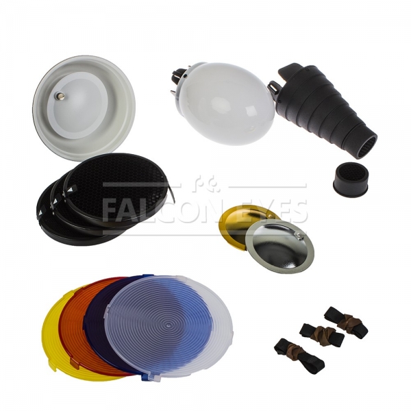 Falcon Eyes FGA-K9 — универсальный набор светоформирующих насадок. Комплект позволит фотографу, куда бы он ни поехал, иметь при себе весь необходимый студийный набор и дополнить вспышку оборудованием для создания всевозможных световых эффектов. Посадочный размер 68×48 мм, все насадки с гибким пластиковым четырехлепестковым хвостовиком, комплектуются стяжками для закрепления на вспышке.