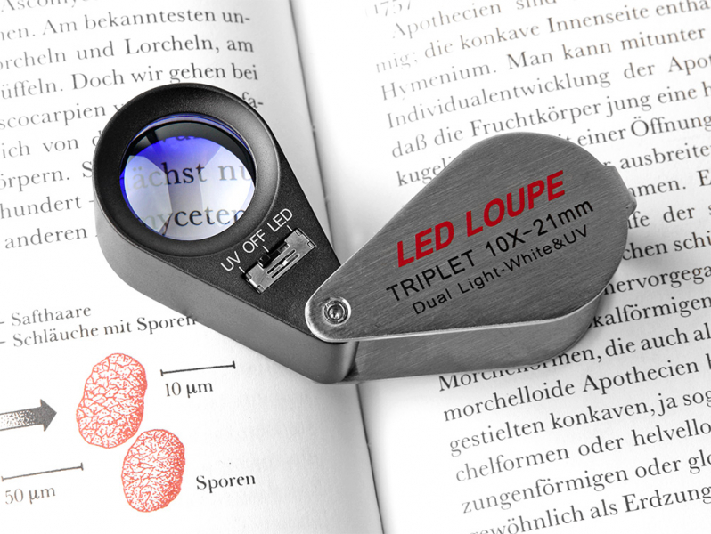 Корпус лупы и оправа изготовлены из металла. Сверху на оправе предусмотрен переключатель подсветки: подсветка поля зрения линзы и УФ подсветка. На нижней части оправы (вокруг линзы) расположены 6 УФ светодиодов и ещё один более мощный УФ светодиод расположен около батарейного отсека. Также на нижней части корпуса находится отсек для батарейки под винтовой крышкой.