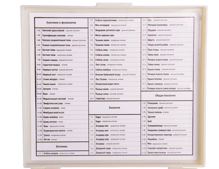 Набор готовых микропрепаратов содержит уже полностью подготовленные образцы биоматериалов. Каждый образец закреплен на предметном стекле и прикрыт покровным стеклом, стекла и биоматериал зафиксированы вместе.