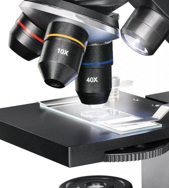 Вес: 1.65 кг. Размер упаковки (ДхШхВ): 30.0×16.5×17.0 см. Микроскоп Bresser National Geographic 40–1280x подойдет для школьников и тех, кто только знакомится с микромиром. Это простой и надежный оптический прибор с широкими функциональными возможностями. В комплекте идет множество оптических аксессуаров и большой набор для проведения опытов. Вы окунетесь в удивительный мир науки с первой же секунды работы с микроскопом. Микроскоп снабжен револьверным устройством на три объектива. Два окуляра 10х и 16х дополнены двукратной линзой Барлоу. Максимальное увеличение при использовании всех оптических аксессуаров составляет 1280х. Настройка на фокус осуществляется широкой рукояткой. Вручную регулируется и положение предметного столика над препаратом. Под столиком находится диск с цветными светофильтрами. Им удобно пользоваться при изучении ярких и прозрачных объектов – детали становятся четче. В зависимости от размера исследуемого образца имеет смысл менять линзы системы освещения. Делается это просто по прилагаемой инструкции. Микроскоп оборудован двумя подсветками и рукояткой регулировки их работы. Можно выбрать, чтобы работала только одна или обе одновременно. Выбор зависит от того, какой образец вы планируете исследовать: прозрачный, полупрозрачный или непрозрачный. При наблюдениях при естественном освещении микроскоп не требует источника питания. Для работы подсветок просто подключите прибор к электросети (кабель в комплекте).