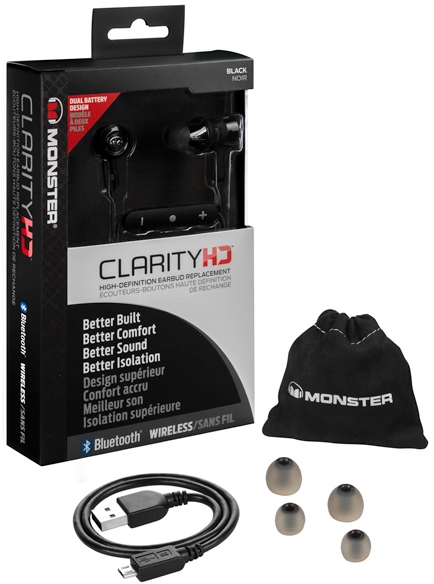 Особенностью беспроводной гарнитуры Monster Clarity HD High Definition In-Ear Bluetooth Headphones являются выраженные насыщенные басы. Оптимальный диапазон громкости, чистое и качественное звучание, отсутствие шумов и помех также являются несомненными достоинствами данной модели. Лаконичный дизайн наушников обеспечен отсутствием всего лишнего как в техническом, так и в визуальном плане. Модель выполнена в черном цвете, лишена массивных элементов и кричащего декора - ее оценят любители простоты и минимализма. Высококачественный силикон и резина, использованные при изготовлении Monster Clarity HD High Definition не меняют свой цвет и имеют высокую износостойкость.