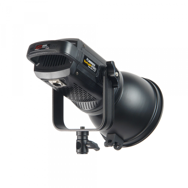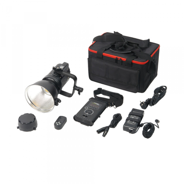 Блок управления с валкодером и цифровым дисплеем снабжен ремнем для переноски или подвешивания на стойке. Длина кабеля для соединения блока с осветителем – 1,9 м. Для питания блока и осветителя используется сетевой DC-адаптер или аккумуляторная батарея V-mount (приобретается отдельно). На расстоянии до 50 м работой осветителя можно также управлять с 99-канального пульта. Малошумный вентилятор и автоматическая защита от перегрева позволяют длительно использовать осветитель при полной мощности. Рефлектор диаметром 175 мм крепится на осветитель посредством байонета Bowens. Его внутренняя поверхность имеет серебристое фактурное покрытие. На рефлекторе предусмотрен держатель для зонта. Металлический корпус осветителя устойчив к механическому воздействию. Металлический кронштейн типа "лира" позволяет отрегулировать наклон осветителя и надежно закрепить в нужном положении с помощью фиксатора с зубчатым соединением и резиновой прокладкой.