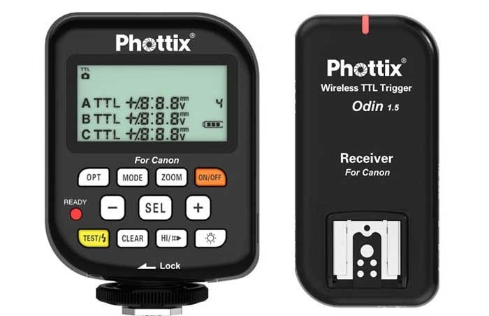Радиосинхронизатор вспышек Phottix Odin TTL для Canon представляет собой передатчик, совмещенный с пультом управления, и приемники для совместимых вспышек. Он позволяет без использования кабелей «поджигать» TTL вспышки, сохраняя в полной мере функции TTL, а также на расстоянии контролировать мощность и фокусное расстояние вспышек. Взаимодействие осуществляется на частоте 2.4 ГГц на расстоянии более чем 100 метров.