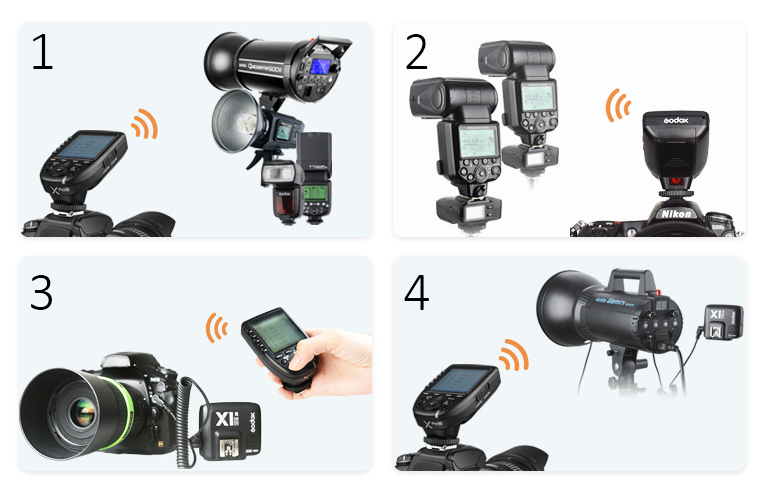 В качестве беспроводного синхронизатора вспышек Godox (накамерных, аккумуляторных и студийных вспышек) В качестве беспроводного синхронизатора накамерных вспышек Nikon В качестве дистанционного пульта управления вспышкой В качестве пульта управления вспышкой (без системы Godox X) с гнездом для синхрокабеля 2,5 мм