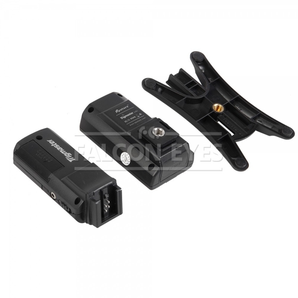 Приемник подключается к накамерной вспышке с помощью разъема «горячий башмак» или к студийной вспышке синхрокабелем из комплекта, работает двух батареек типа ААА и «запускает» вспышку при получении сигнала от передатчика. Резьба 1/4" позволит закрепить приемник с вспышкой на опоре (стойка, штатив и т. д.). В конструкции реализована защита от помех. Скорость синхронизации до 1/250 секунды. В комплекте: две батарейка типа ААА, одна батарейка типа 23А, синхрокабель 2,5 мм — PC, синхрокабель 2,5 мм — 3,5 мм, синхрокабель 2,5 мм — синхроконтакт камеры (см. таблицу совместимости), переходник 3,5 мм — 6,3 мм.