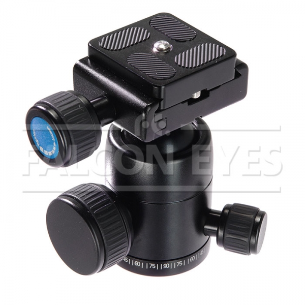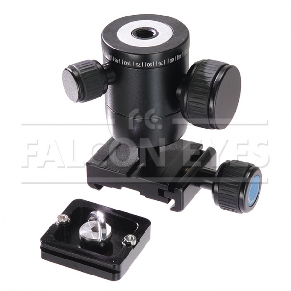 Falcon Eyes ВН-25 — шаровая штативная голова с быстросъемной площадкой, изготовлена из алюминиево-магниевого сплава, предназначена для установки камер с креплением 1/4" и весом до 10 кг. Особенностью шаровой головы является возможность контролировать все три оси движения и фиксировать положение одним замком. При небольшом собственном весе — всего 295 г, обладает высокой прочностью, прецизионным исполнением и выдерживает нагрузку до кг. Голову BH-25 можно использовать с любыми штативами, моноподами или другими опорами, имеющими установочный винт диаметром 3/8". Нижняя база головки снабжена поворотным механизмом с независимым фиксатором положения и шкалой для горизонтального панорамирования. Также на базе расположен фиксатора шара, который управляет всеми положениями головки. Вращение рукояток плавное с дозированным усилием, а фиксация быстрая и надежная. Установив усилие зажима на близком к максимальному уровню, вращение шара происходит плавно и без «рывков».