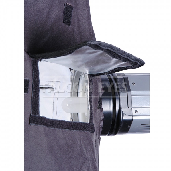 Закрытая конструкция позволяет избежать нежелательных бликов и потерь светового потока. Отражатель, с серебристой тканью внутри, обеспечивает равномерную засветку рассеивателя, который в свою очередь, благодаря большой поверхности, смягчает формируемые тени. Дополнительный внутренний диффузор улучшает равномерность светового потока. Наконечники на упругих металлических спицах не повреждают тканевые спицедержатели софтбокса и облегчают сборку конструкции.