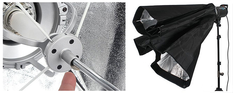 Закрытая конструкция исключает паразитные блики и потери светового потока. Отражающая серебристая поверхность обеспечивает равномерное распределение света внутри софтбокса, белые полупрозрачные рассеиватели делают свет более мягким.