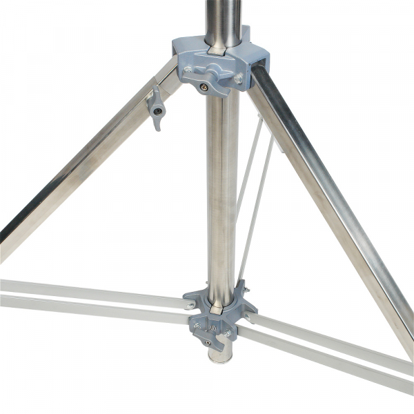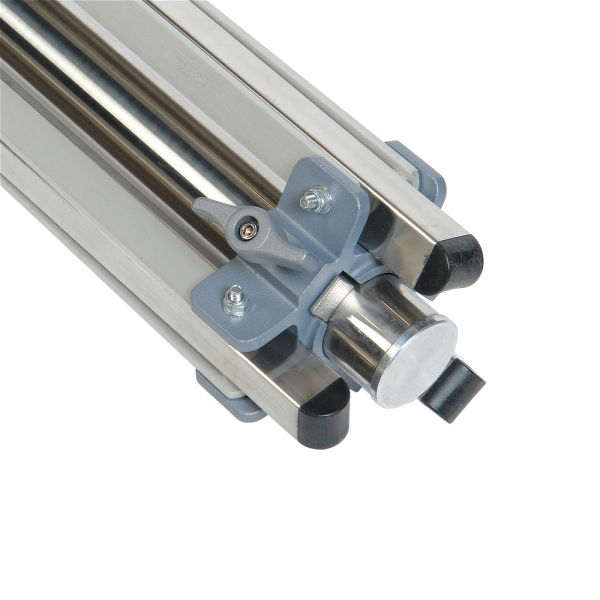 - Прочные ножки из прямоугольного стального профиля (26 х 26 мм) обеспечивают устойчивое положение стойки на любой поверхности. Благодаря пластиковым насадкам они не царапают пол. Одна из ног – телескопическая (длина увеличивается на 25 см). Это дает возможность использовать стойку на поверхности с перепадом высот, например на лестнице, или наклонить ее под нужным углом, если дополнительно укомплектовать подходящим противовесом.