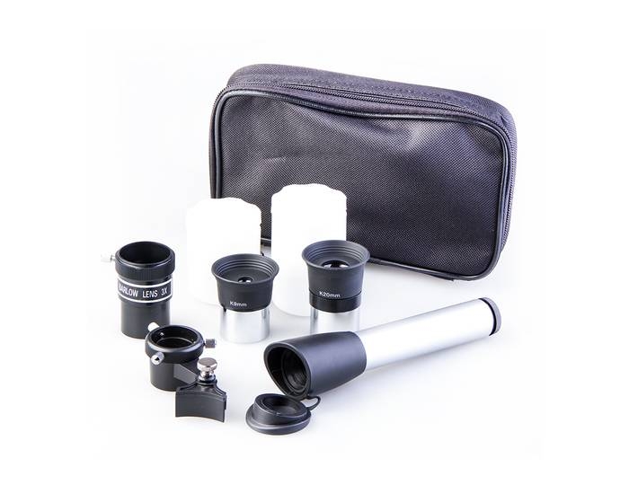 Об окулярной части следует сказать особо: она расположена под углом 45° к оси прибора, и может поворачиваться вокруг своей оси на 360° (8 фикс.положений). Все это делает очень комфортным наблюдение - как из положения сидя, так и из положения стоя. При этом изображение не зеркальное, где "лево" и "право" поменялись местами, а прямое! (в конструкции используется призма с "крышей"). Телескоп снабжен простой азимутальной монтировкой с пластиковым штативом, практически для "настольного" использования. Две микрометрические рукоятки наведения и видоискатель (6х, входит в комплект) позволяют точно ориентировать телескоп на цель. Если вы не планируете совершать выезды на пикники, то эти монтировку и штатив можно оставить. Если планируете - мы рекомендуем приобрести штатив с телескопическими ножками (алюминиевые, деревянные, стальные - без разницы), монтировка подойдет EQ1 или EQ2. Или можно купить обычный фотографический штатив, резьбовое отверстие под крепление 1/4" находится в площадке внизу на корпусе телескопа.