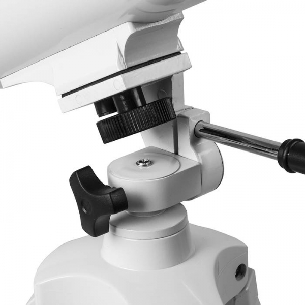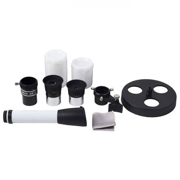 Этот телескоп дает прямое (не перевернутое) изображение. Наличие в окулярном блоке оборачивающей призмы (а не диагонального зеркала, как в аналогичных моделях других фирм), делает изображение изображение не зеркальным (где левое и правое меняются местами), а таким, каким обычно вы видите его невооруженным глазом. Для удобства наблюдения (из положения стоя или сидя), окулярную часть вместе с призмой можно поворачивать, 8 фиксированных положений. С помощью искателя (входит в комплект, увеличение 6х, крепится к телескопу) можно быстро навестись на цель наблюдения. Телескоп снабжен азимутальной монтировкой AZ (металл) белого цвета. Такой монтировкой удобнее пользоваться если вы наблюдаете наземные объекты. Всего одна ручка позволяет управлять прибором и по вертикали и по горизонтали. Имеется фиксатор найденного положения. Телескоп поставляется с алюминиевым штативом с возможностью регулировки высоты. Распорки для ножек служат не только для повышения устойчивости, но и в качестве подставки под полочку для аксессуаров (идет в комплекте). Сумка для переноски, в которую укладывается весь комплект, позволяет безопасно (для оптики и внешнего вида) транспортировать прибор для выездов на природу или при походах в гости.