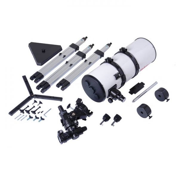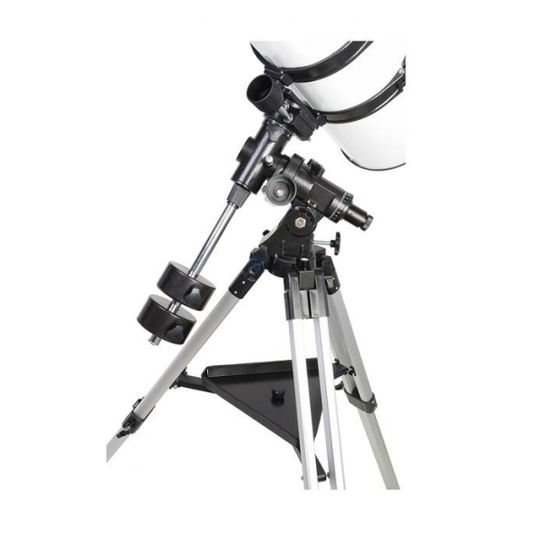 Телескоп поставляется с профессиональной монтировкой немецкого типа EQ4 со встроенным искателем полюса (это оптическая трубка с перекрестьем, интегрированная внутрь монтировки). Мощный алюминиевый штатив снабжен металлическими распорками, на которые можно установить столик для аксессуаров. В общем, Veber 800/203 очень надежный, устойчивый телескоп для серьезных наблюдений (даже исследований!) с превосходным качеством изображения и весьма разумной ценой.