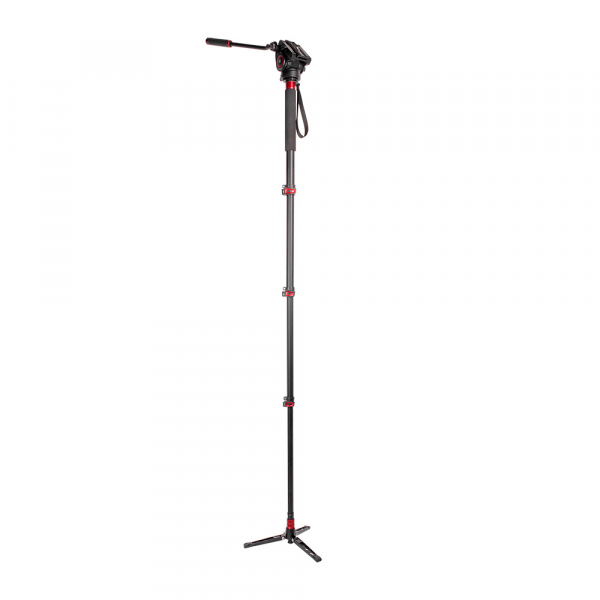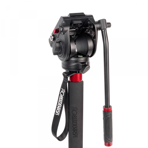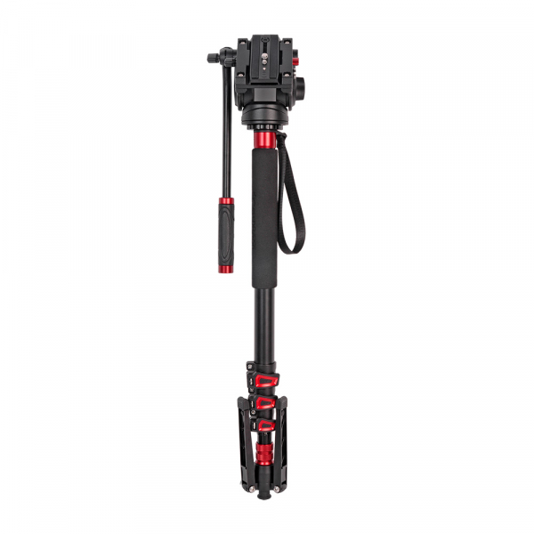 Четыре секции из алюминиевого сплава с надёжными и эргономичными клипсовыми зажимами из ABS пластика — при поспешном «отщёлкивании» клипс оператор не травмирует пальцы отскочившим зажимным язычком. Диаметр секций — 33 / 29 / 26 / 22 мм. При ослаблении клипсового фиксатора — возможна регулировка усилия зажима гайкой под шестигранный ключ (идёт в комплекте). На верхней секции предусмотрены: накладка-рукав из вспененного материала для комфортного удержания монопода в холодное время года и кистевой ремень. На круглой площадка верхней базы монопода находится (реверсивный) винт 1/4″ — 3/8″, на который крепится видеоголовка, а при необходимости непосредственно камера. Для выставления камеры по горизонту, в основании головки имеется пузырьковый уровень.