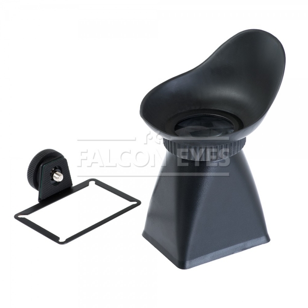 Предназначен для использования с камерами Sony Nex 3/Nex 5. Позволяет превратить ЖК-экран камеры в большой и удобный видоискатель. Увеличивающая линза (2,8х) позволяет лучше оценить глубину резкости и экспозицию, этот видоискатель незаменим при работе на ярком солнечном свете. Сначала металлическая рамка с кронштейном крепятся к ф/а посредством винта 1/4 дюйма, который заворачивается в штативное гнездо камеры. С обратной стороны этого винта (с кольцом) имеется резьбовое отверстие 1/4 дюйма для установки всей системы на штатив или риг. Винт имеет возможность продольной подвижки в пределах 5 мм, чтобы обеспечить плотное прилегание рамки к фотоаппарату. Корпус видоискателя изготовлен из жесткого 2,5 мм инженерного пластика, изнутри обклеен бархатной тканью. В торце корпуса (заподлицо с плоскостью торца) укреплены четыре мощных магнита. В рабочем положении корпус видоискателя крепко «примагничен» к установленной металлической рамке, он имеет возможность переустановки для использования как под правый, так и под левый глаз.